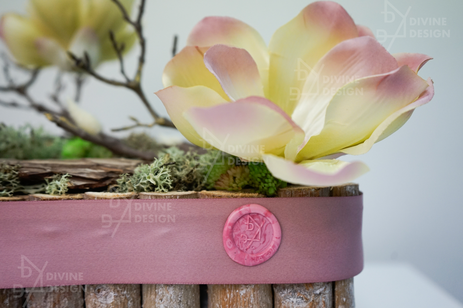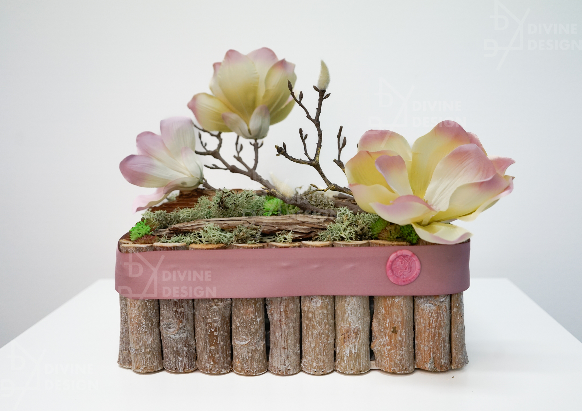 Dřevěný truhlík je profesionálně navržen s důrazem na detail, doplněný o přírodní kůru, která vytváří výrazný kontrast s umělou magnólií, jejíž květy zaujmou svým realistickým vzhledem a nádhernou barevností. Kromě magnólie obsahuje toto elegantní dekorativní aranžmá také islandský mech, umělý sukulent a tilancii, díky čemuž vznikne pestrá a bohatá dekorace vhodná do každého prostoru.