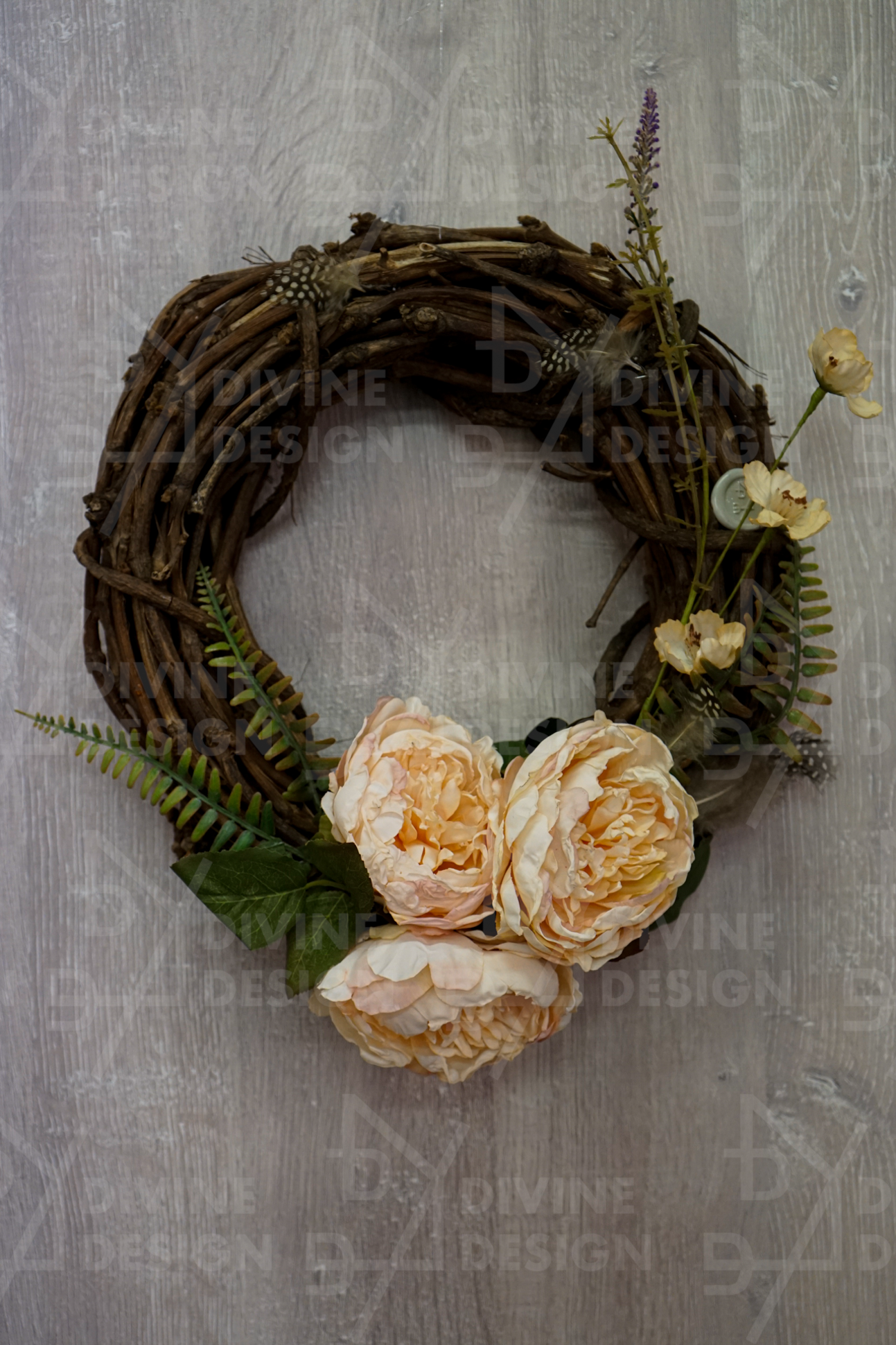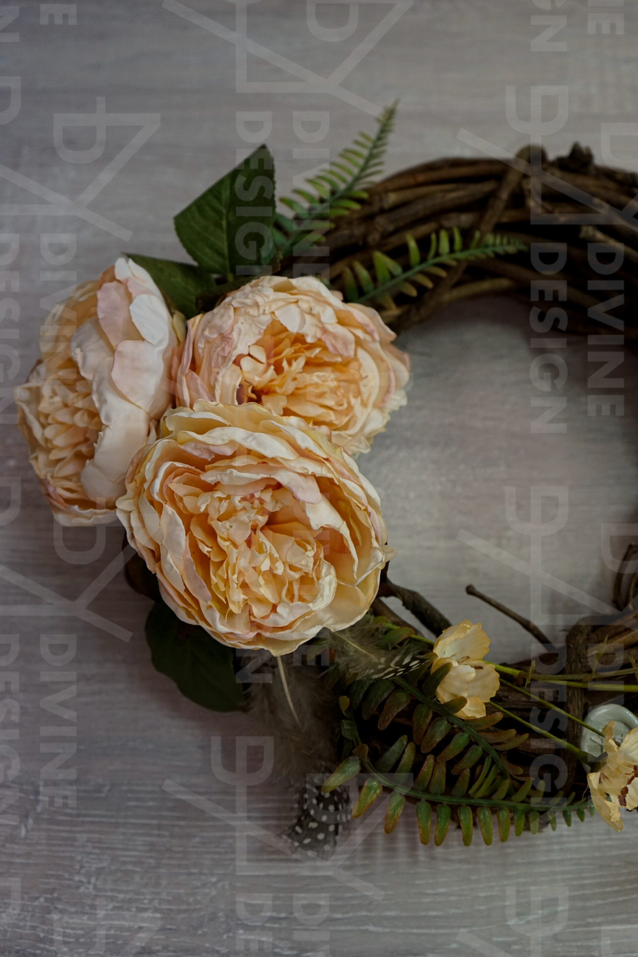 Jarní věnec na dveře – žluté pivoňky s peříčkem je skutečně výjimečný díky zdobení umělými žlutými pivoňkami, které svým svěžím vzhledem a zářivými barvami dodávají okolí pocit slunečného dne. K těmto květům jsou přidány jemné kapradí a luční kvítí, což přidává aranžmá přírodní šarm, rozmanitost a hloubku, díky níž si každý okamžitě zamiluje jeho přirozenost a živost.