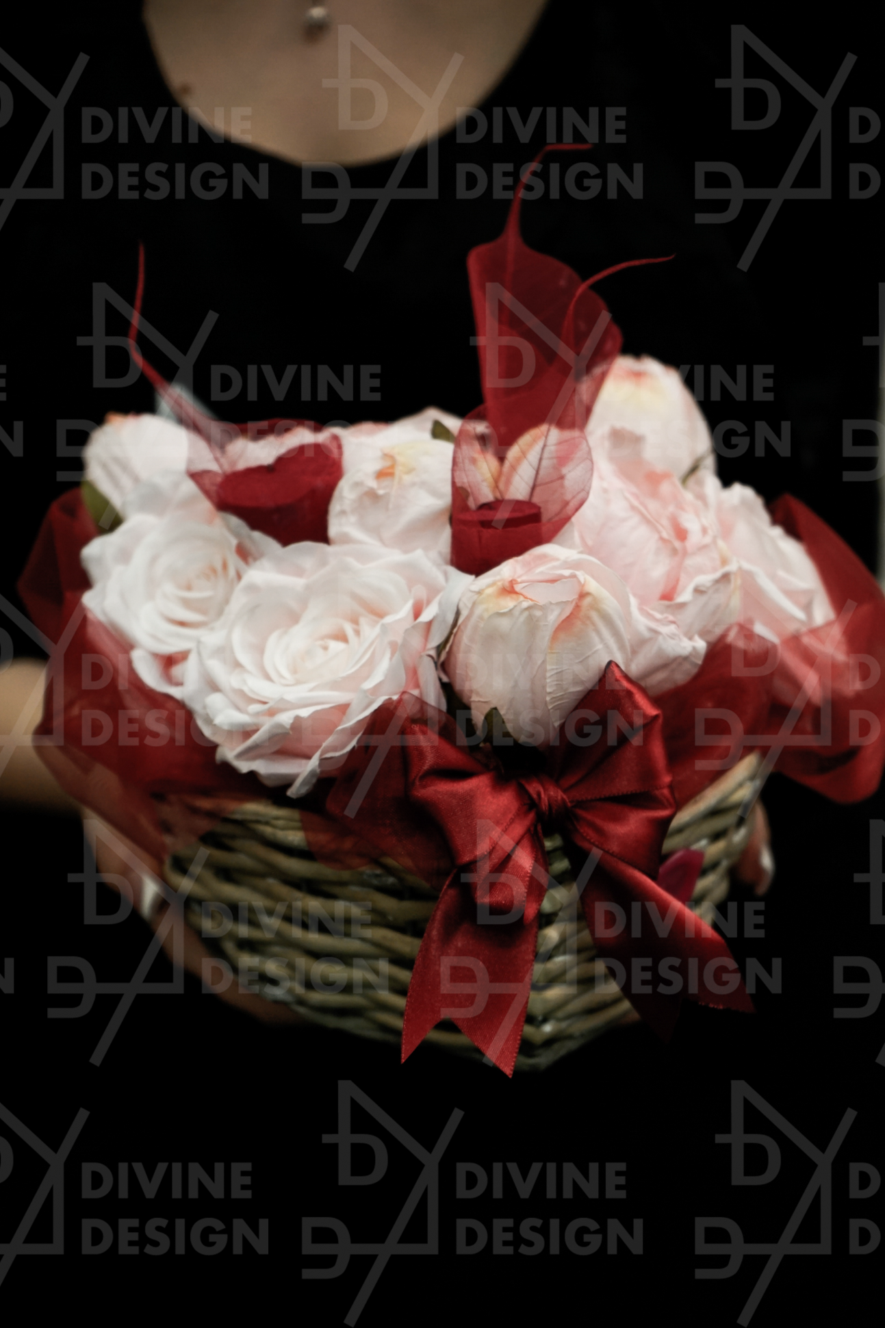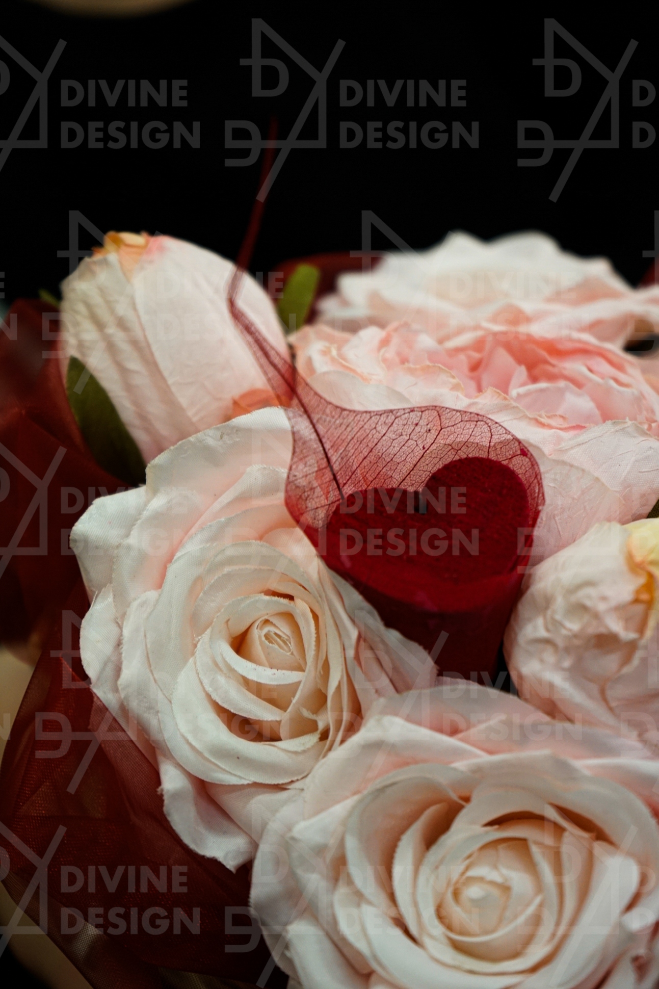 Romantické vypichované srdce je bohatě ozdobeno okouzlujícími růžovými pivoňkami a růžovými růžemi, jež tvoří harmonickou kombinaci jemných tónů, eleganci a půvab. Přidané preparované listy přispívají k texturovosti a hloubce aranžmá, čímž zvýrazňují jeho přitažlivost a romantickou atmosféru.