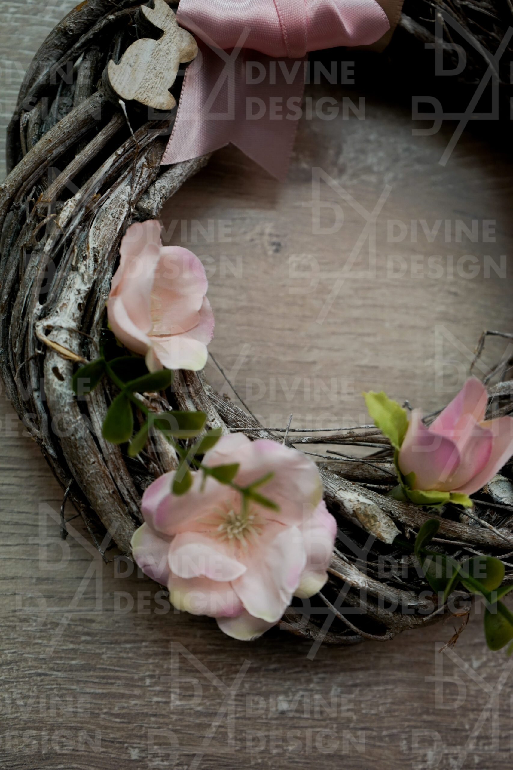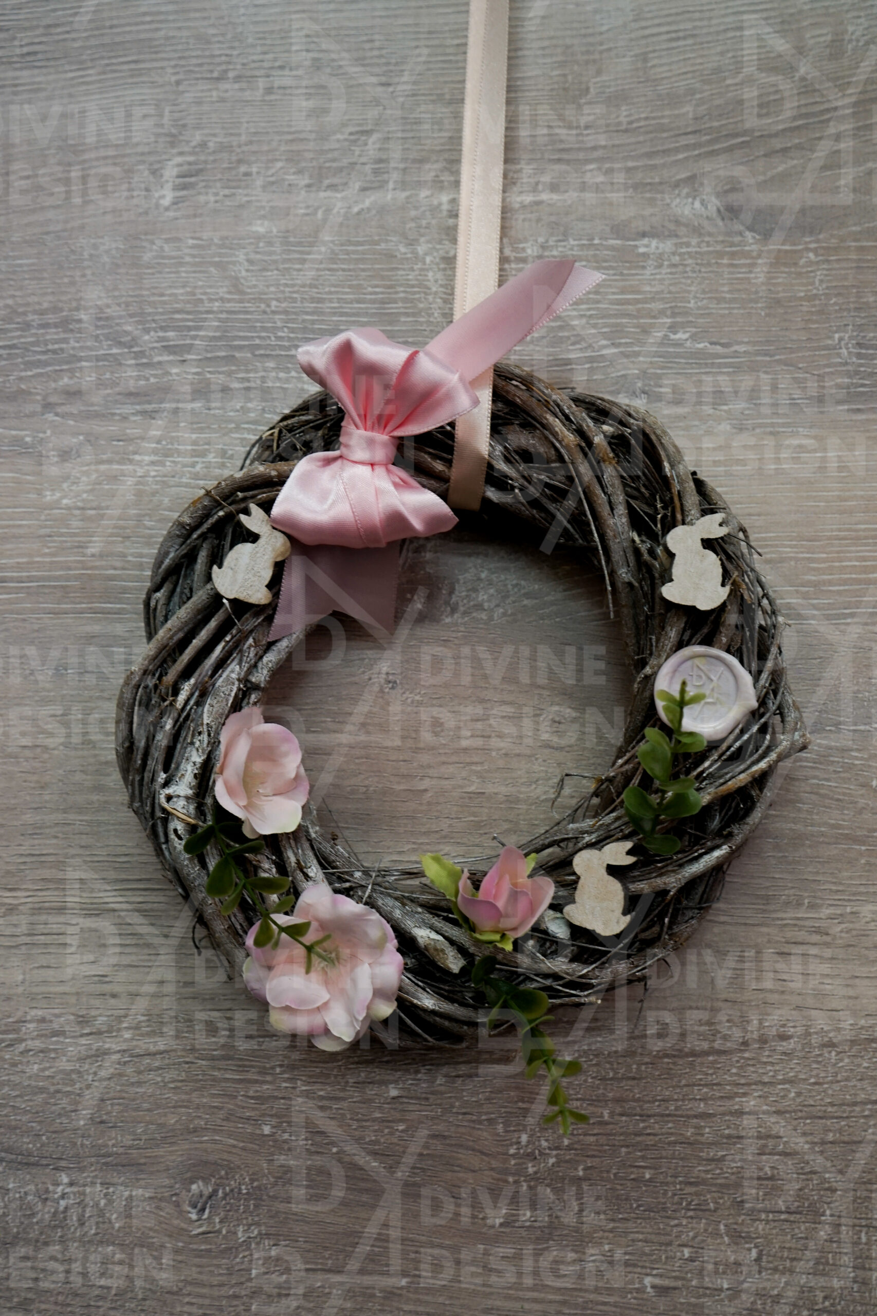 Hlavními dekorativními prvky jsou roztomilí dřevění zajíčci, kteří dodávají celému věnci hravost, zábavu a osobitost, a tak umocňují veselou velikonoční náladu. Celou dekoraci navíc elegantně dotváří saténová mašle, která přidává šmrnc, styl a dokonale zakončuje celkový vzhled.