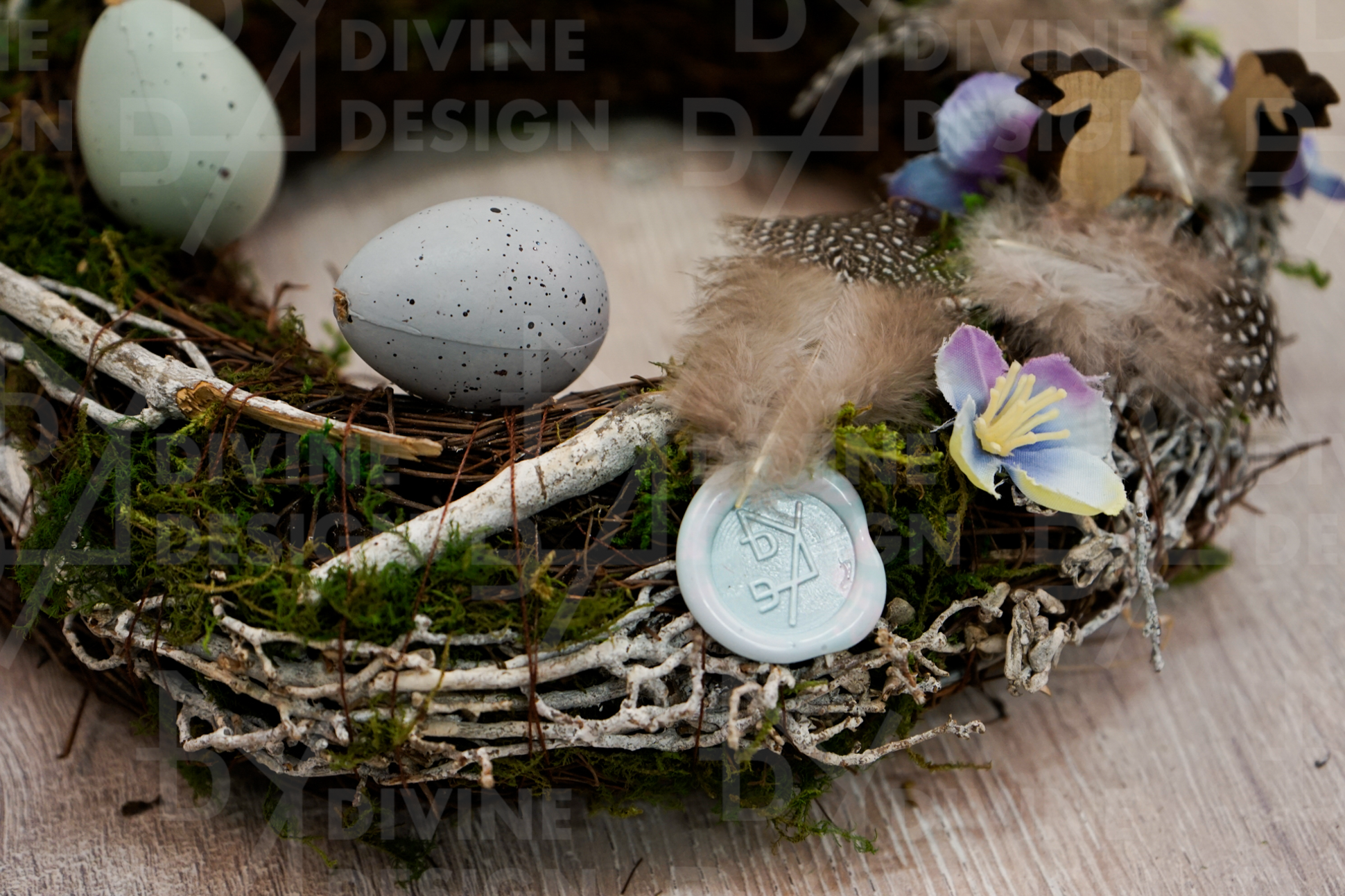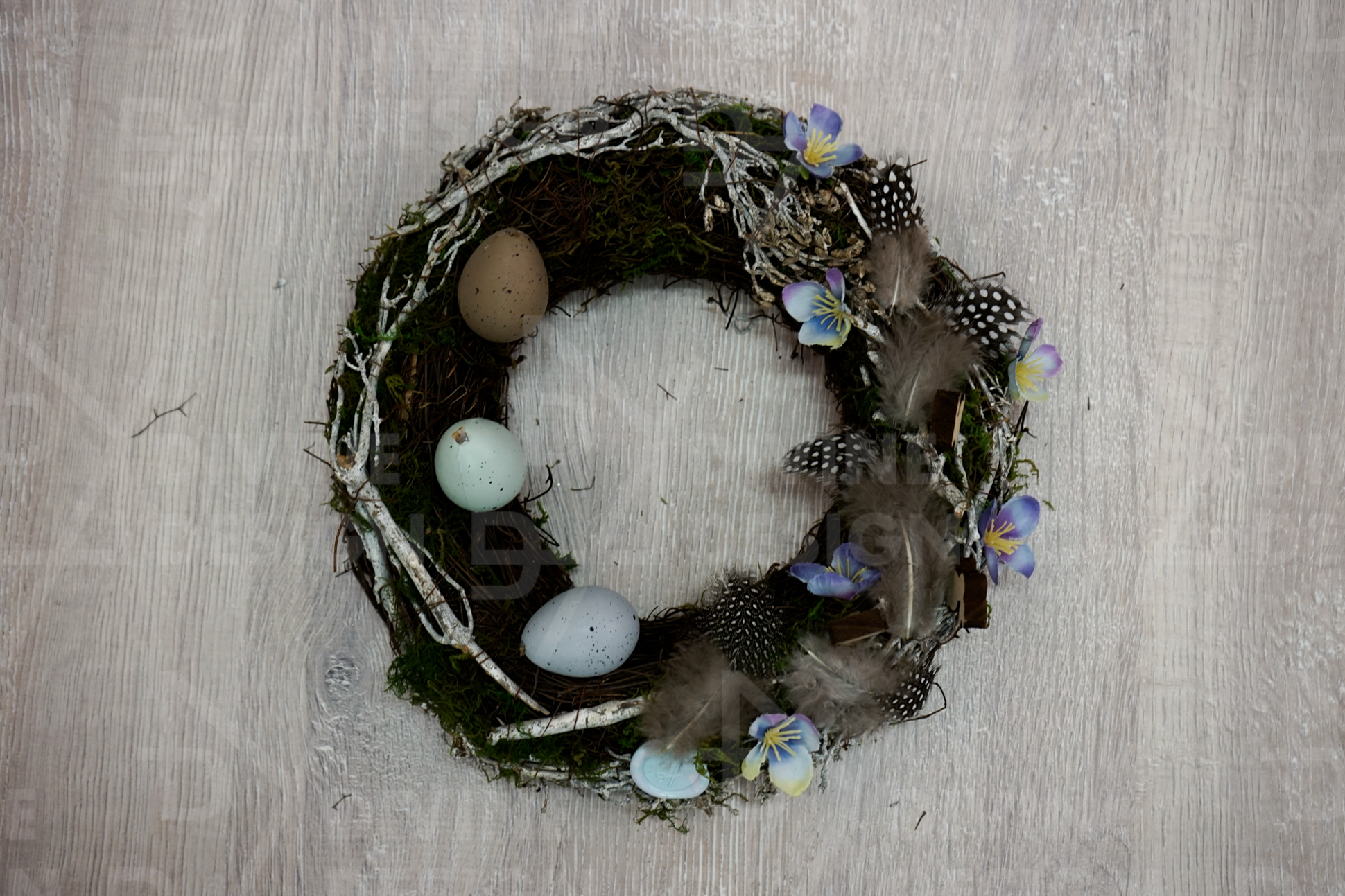 Věnec je bohatě ozdoben atraktivním mixem vajíček, jež symbolizují nové začátky, naději a radostné jarní období. Modrá kvítka přinášejí do dekorace svěží jarní krásu a relaxační náladu, zatímco malí dřevění zajíčci dodávají celému aranžmá hravost, roztomilost a připomínají kouzlo velikonočních svátků.