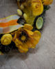Základem tohoto velikonočního věnce na stůl je přírodní mechový věnec, který do aranžmá přináší rustikální šarm a přirozený vzhled. Na něm jsou pečlivě umístěny umělé pryskyřičníky a žluté vlčí máky, jež slavnostně a hravě zvýrazňují barvy a symbolizují jarní krásu a obnovu přírody.