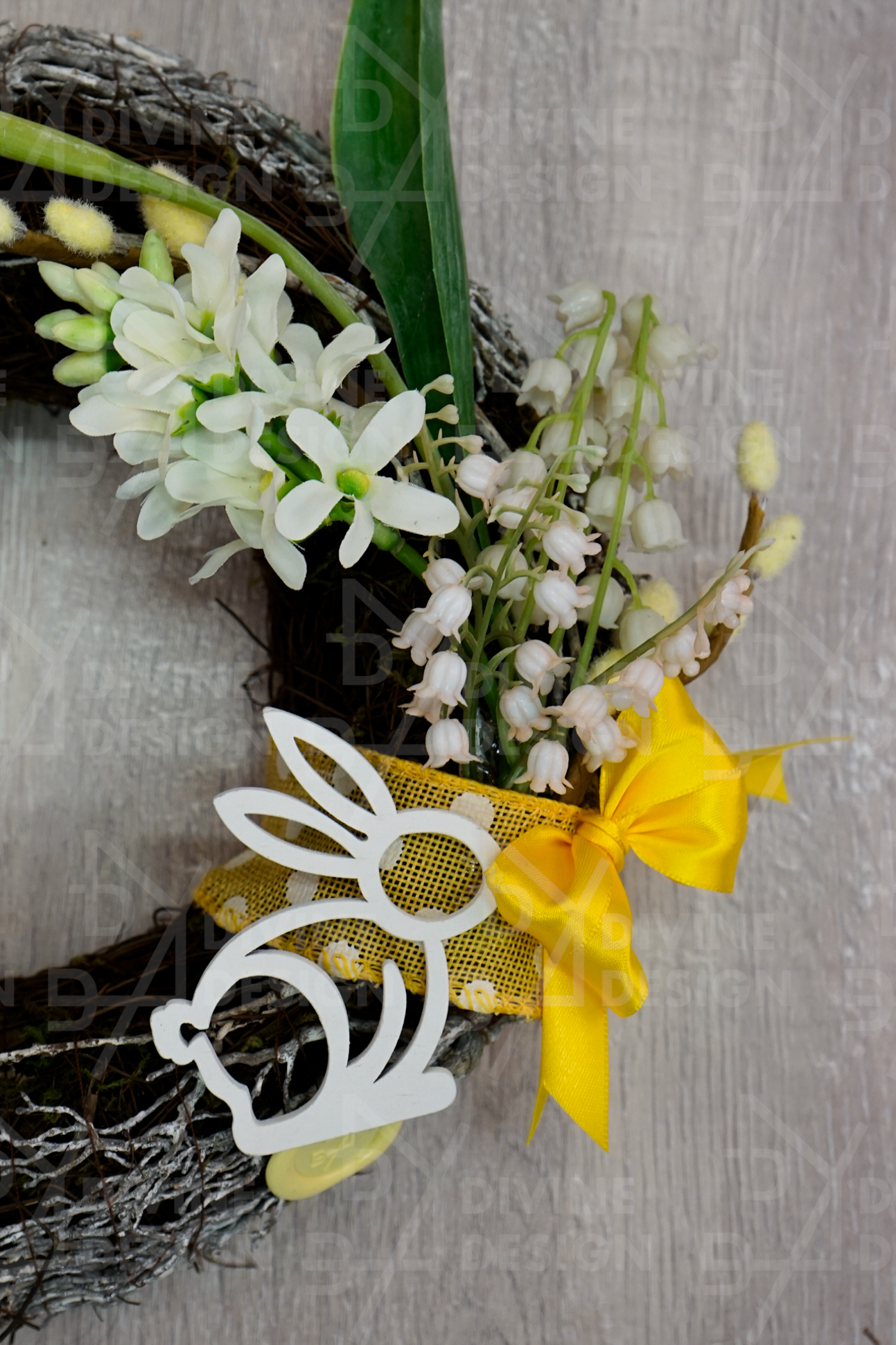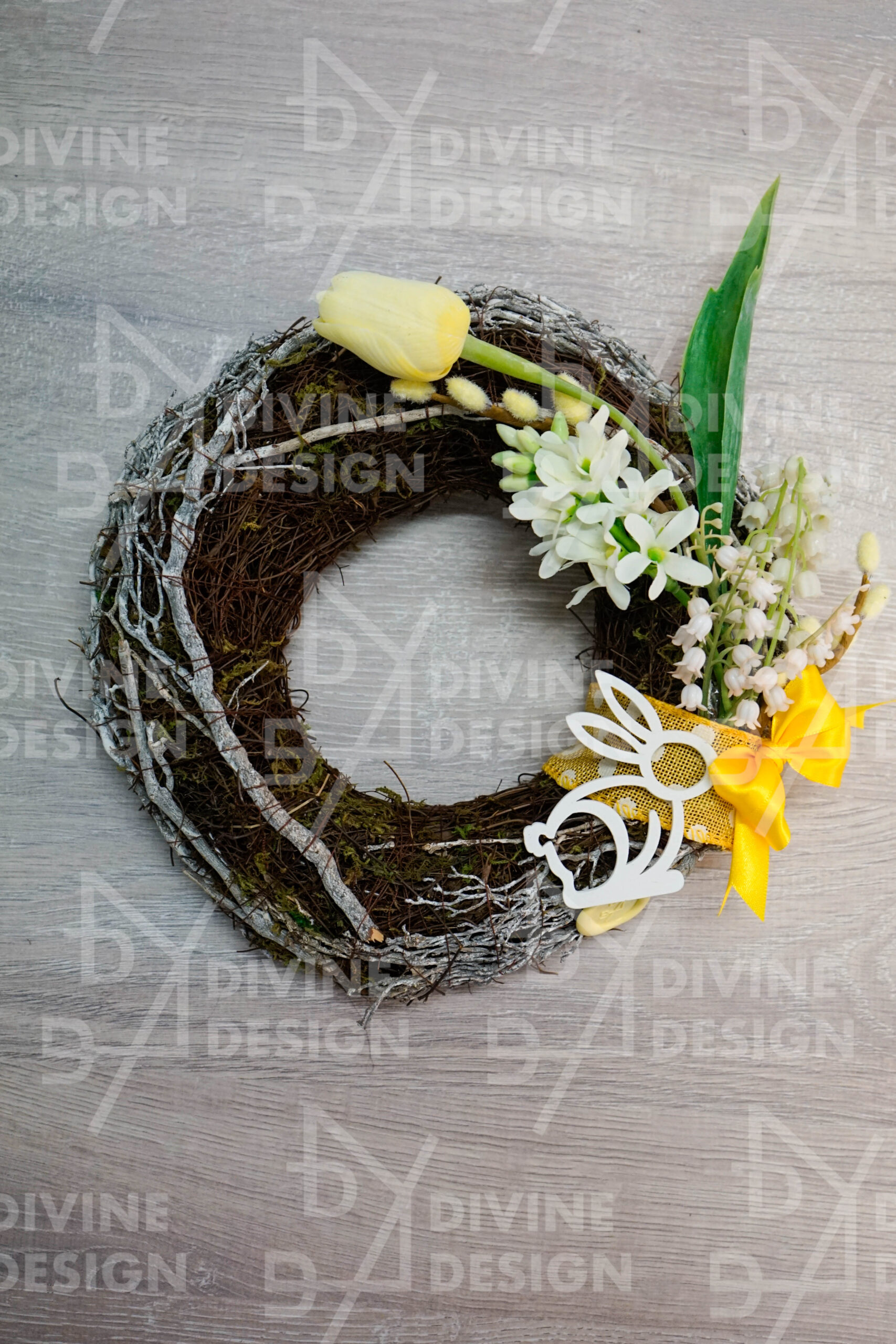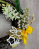 Hlavním ozdobným prvkem je roztomilý dřevěný zajíček, který působí hravě a kouzelně, a celou kompozici doplňuje stylová saténová mašle, jež věncovým aranžmá dodává šmrnc a slavnostní nádech.