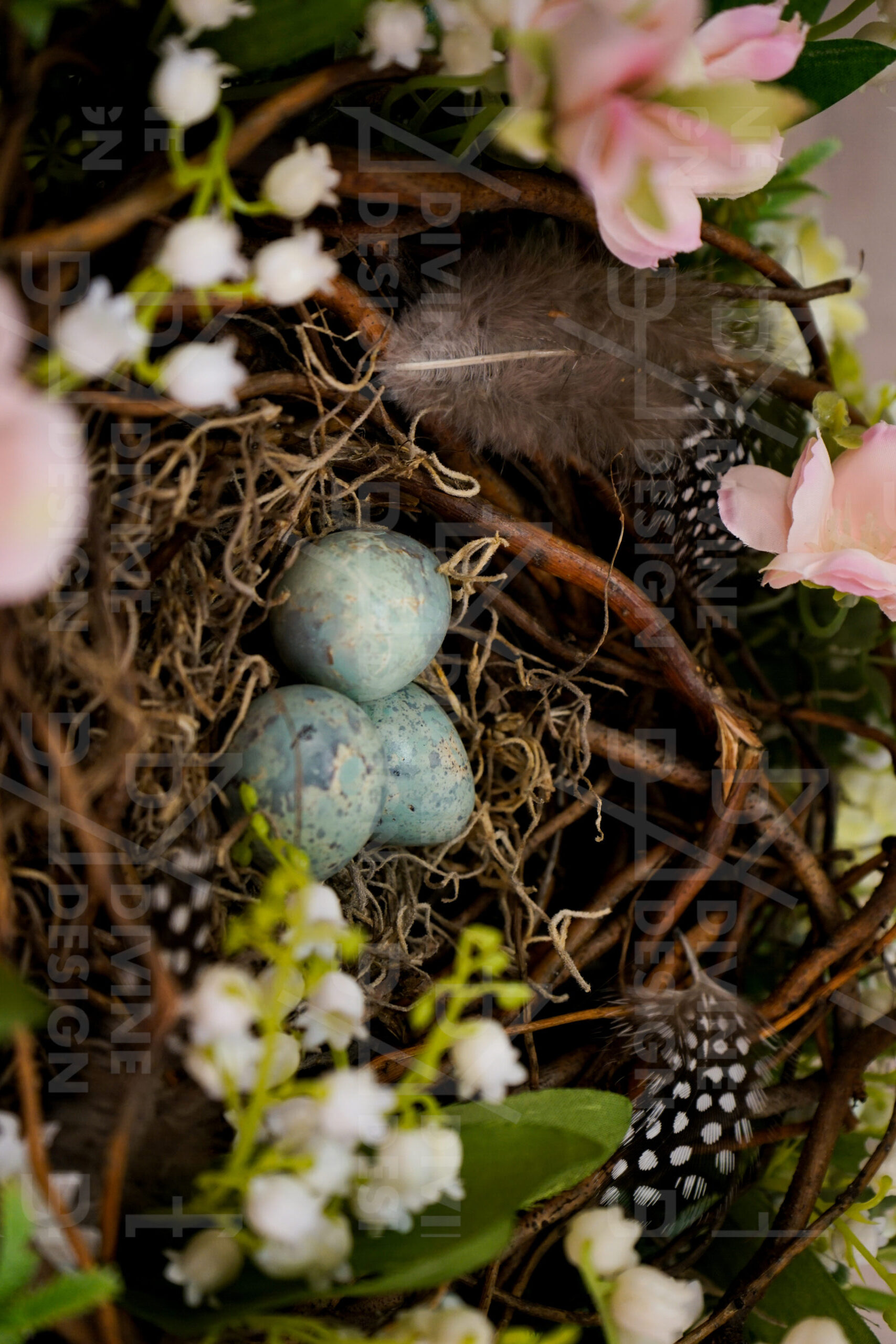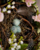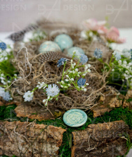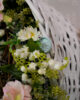 Ratanový koš, proutěné hnízdo, tilancie, křepelčí vajíčka, peříčka, konvalinky, mix kvítků, mix zeleň, luční kopretiny, saténové mašle.