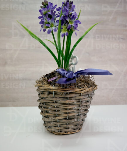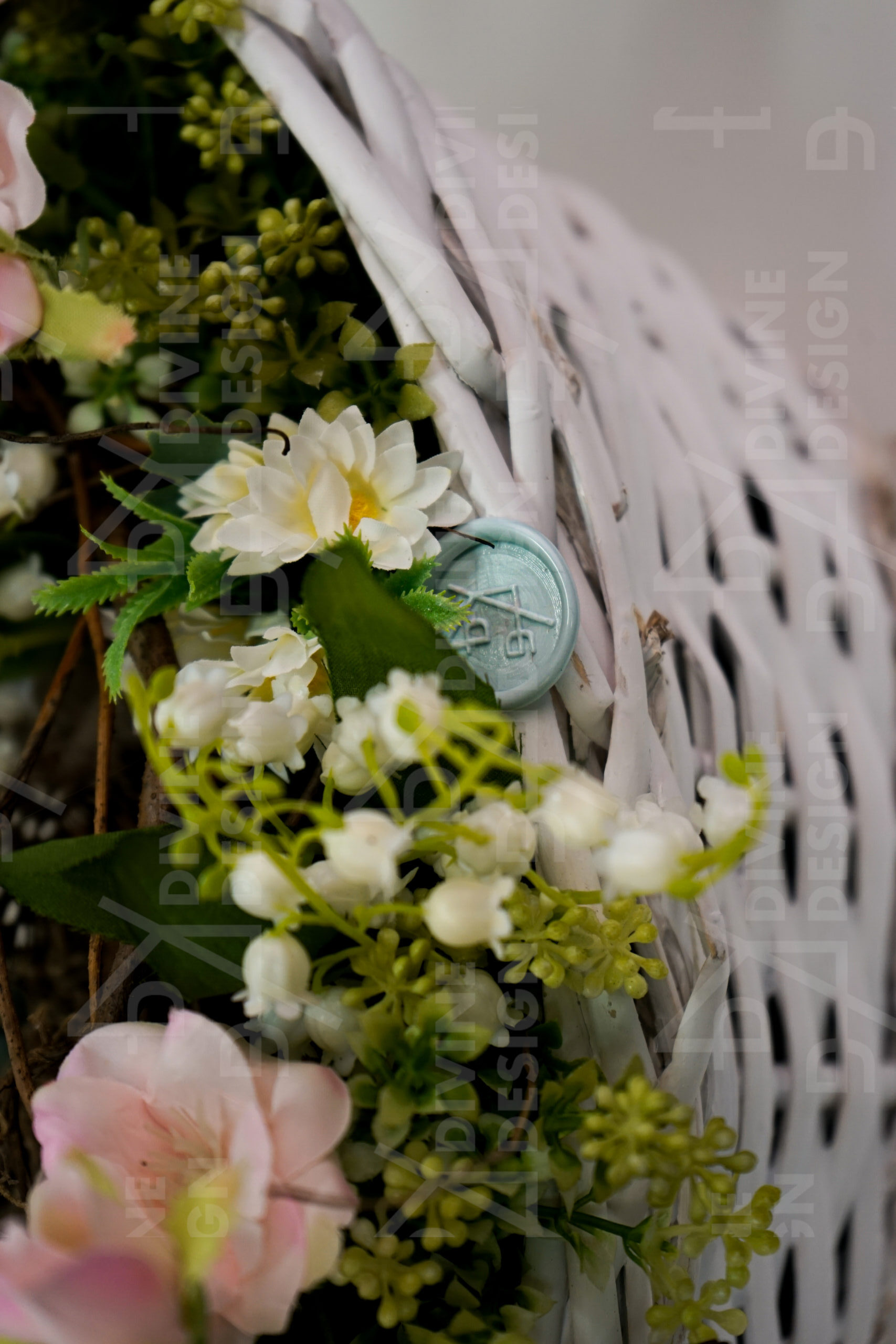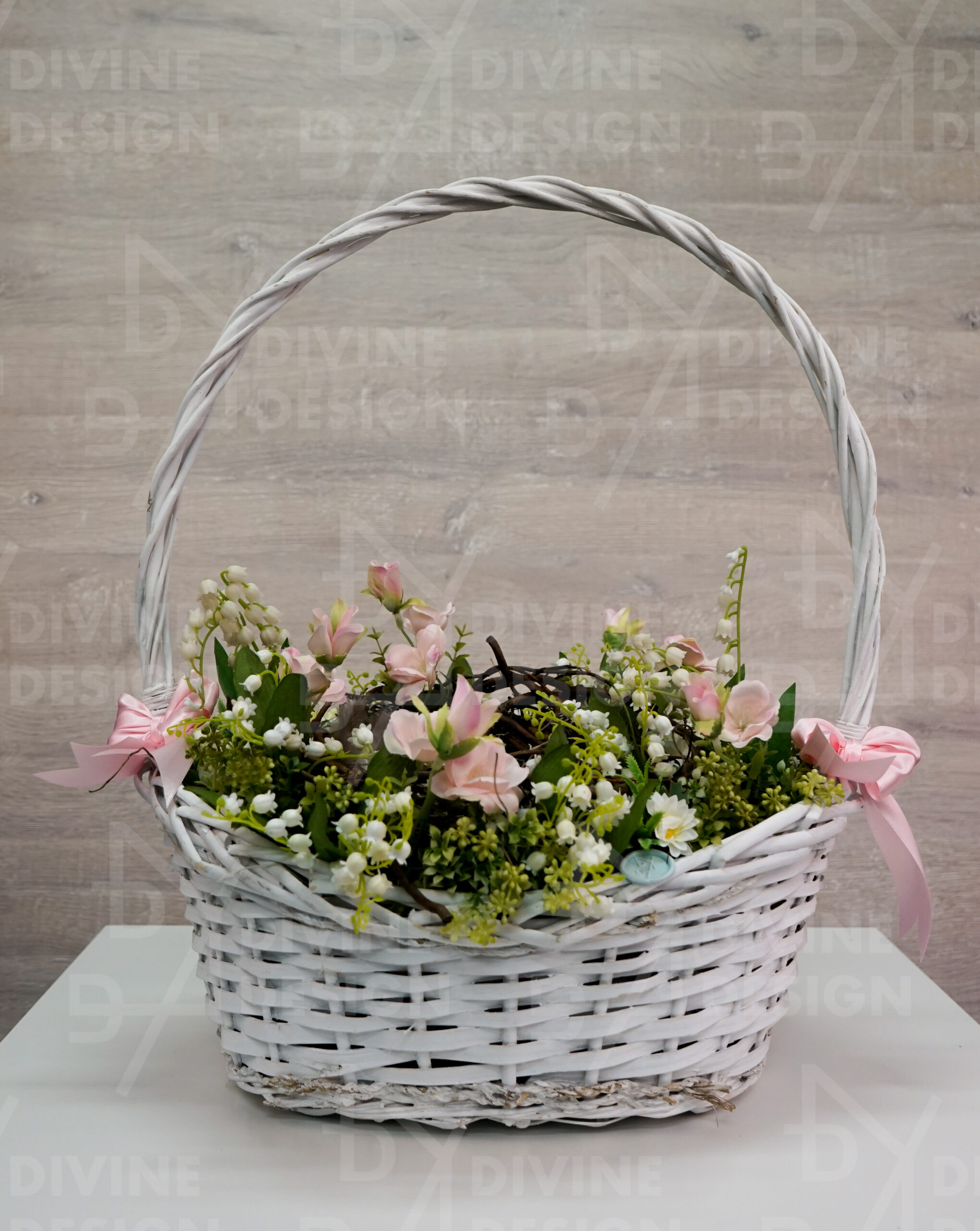 Celou aranžmá završují styly saténové mašle, které dodávají šmrnc, slavnostní atmosféru a dokonale ladí s celkovým vzhledem. Všechny rostlinné prvky jsou zhotovené z umělých materiálů, což zajišťuje jejich dlouhou životnost a minimální požadavky na údržbu, takže si tento krásný koš užijete ještě dlouhá léta.