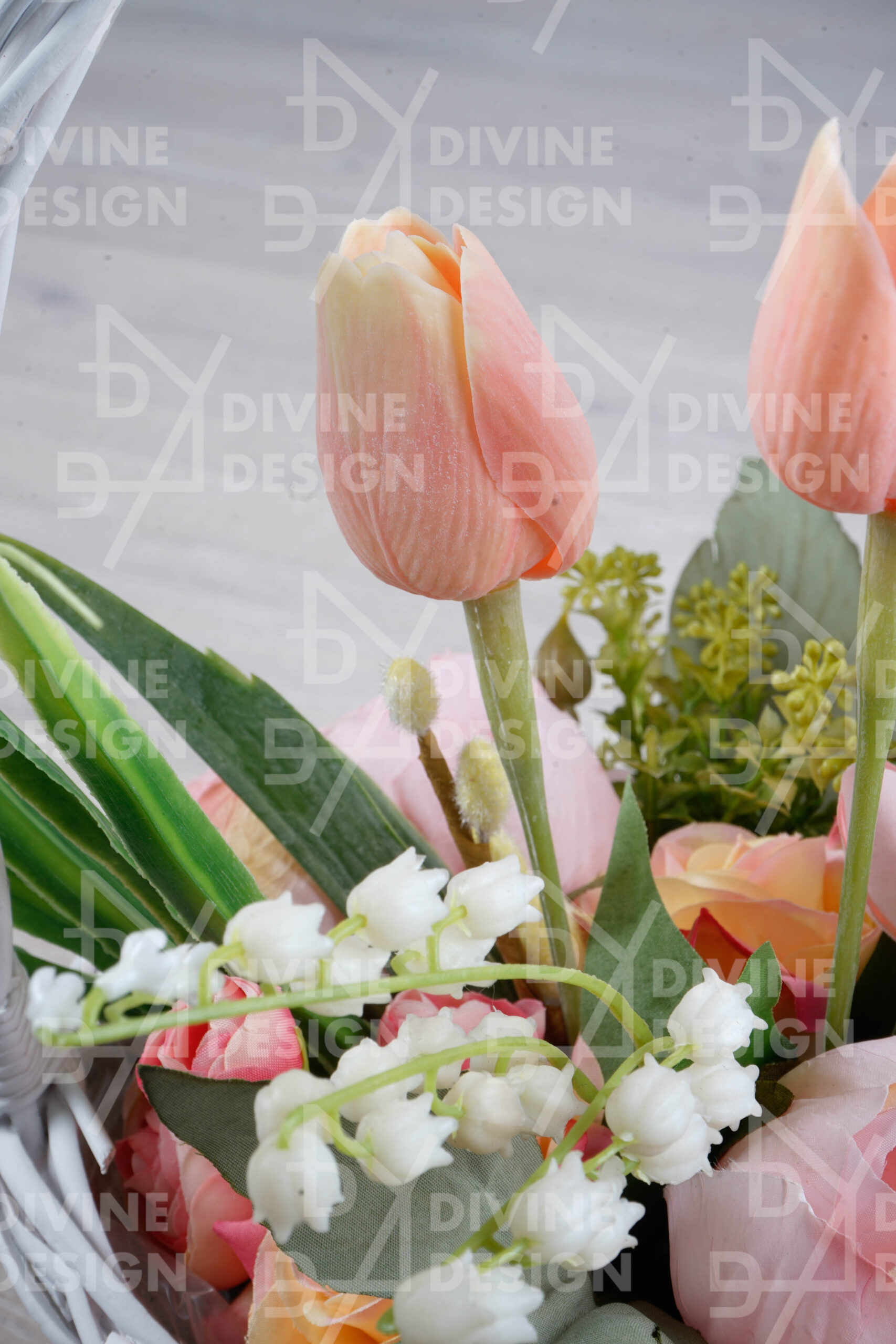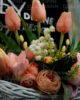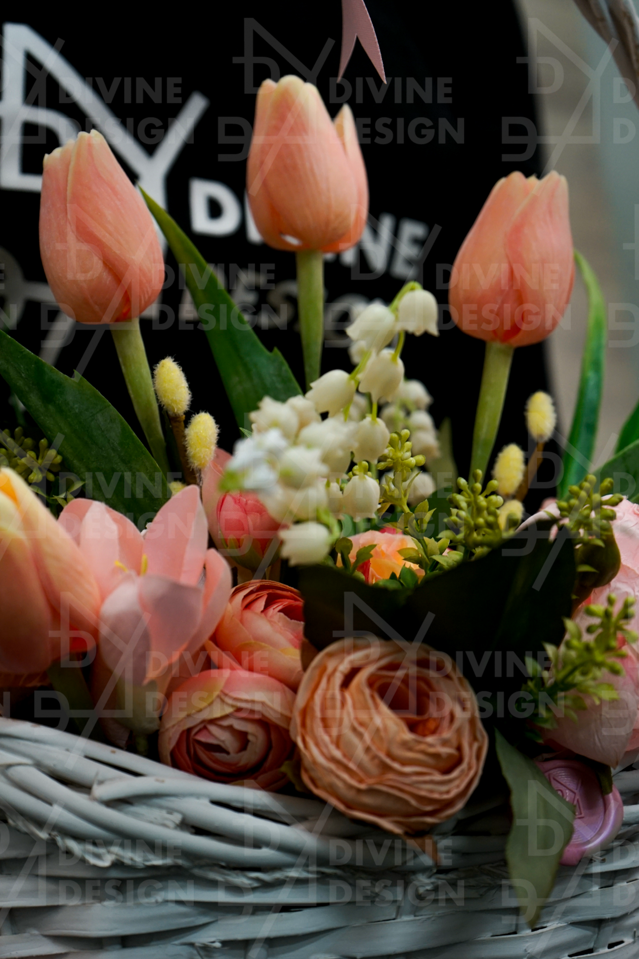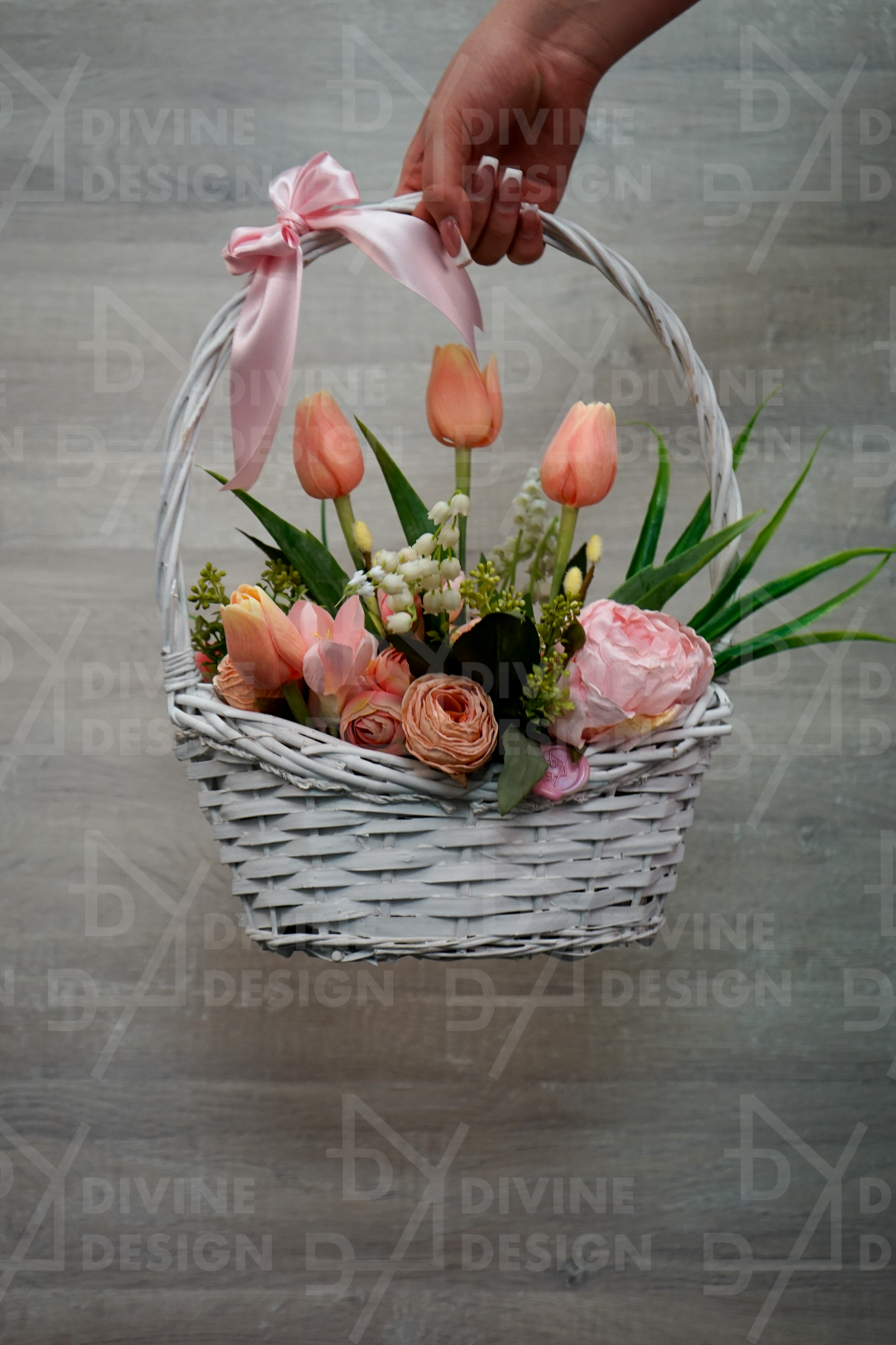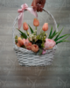 Bílý ratanový koš, tulipány, pivoňky, růže, kočičky, krokus, mix zeleň, saténová mašle. DOPORUČUJEME OSOBNÍ ODBĚR