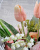 Základem tohoto velikonočního vypichovaného koše je bílý ratanový koš, který dodává celému aranžmá moderní a přirozený vzhled. Uvnitř se nachází bohatý mix umělých růžových tulipánů, pivoňek, růží a krokusů, jež vytvářejí živou a pestrou kompozici, symbolizující příchod jara a nový začátek.