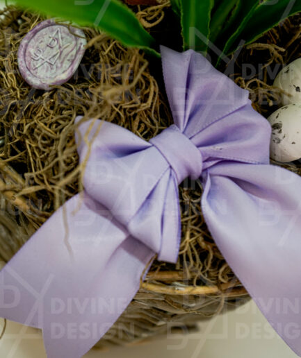 Velikonoční dekorace v ratanovém květináči – hyacint se zajíčkem